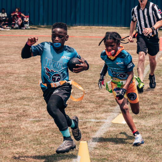 Youth flag football for boys & girls ages 4-14. One day a week commitment. All practices and games are held on Sunday. Non-contact. Recreational. A reversible TITANS Jersey and flag belt are included in the registration fee for all players to keep.